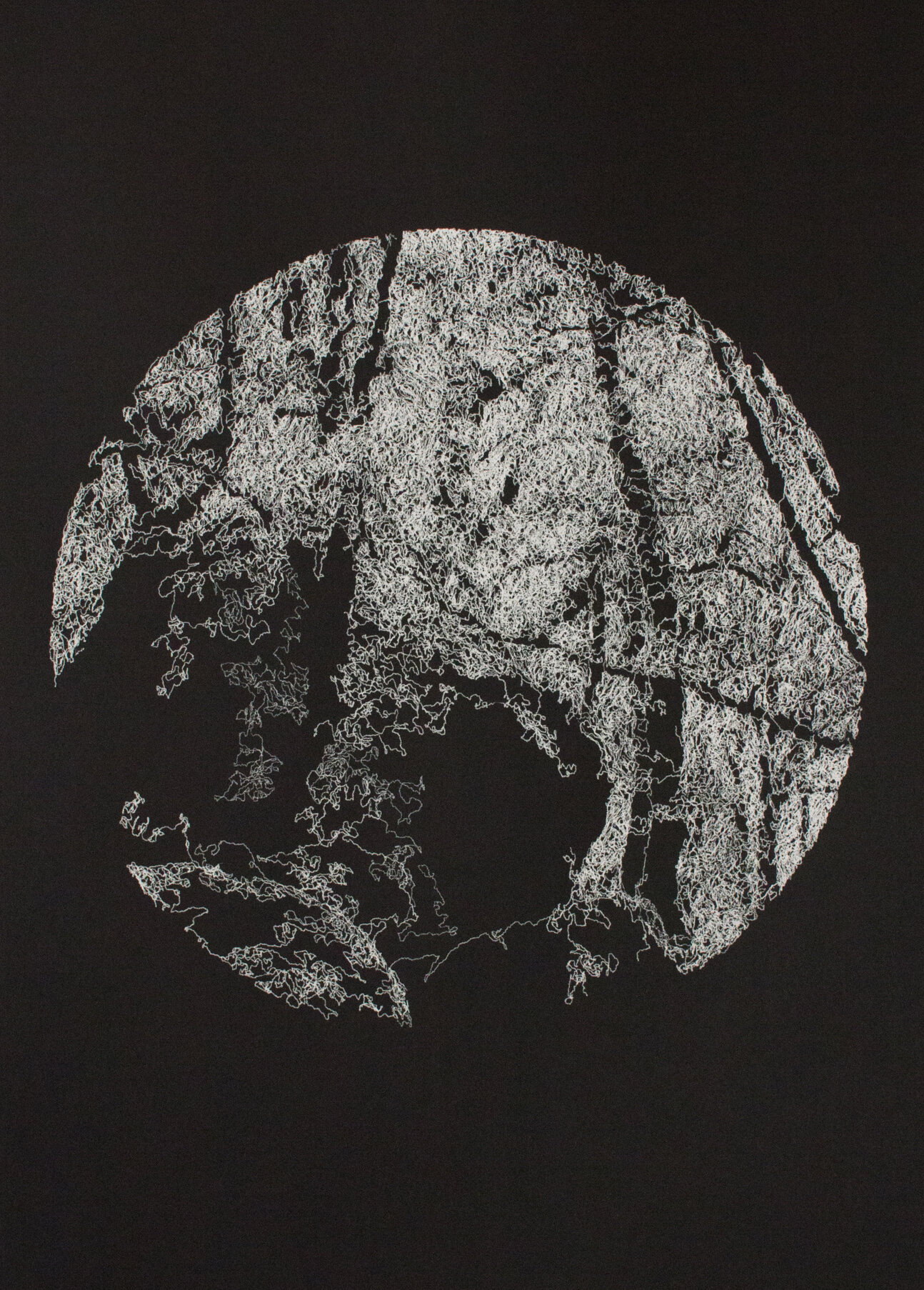 To generate the feel of the light and space Nicholas has reconfigured the captured scene by using a custom made digital programme. One which embarks on its own journey through a pixelated photographic image, recording its path into a myriad of vectored lines. Lines which follow the shape of the trees, the foliage, the light and the shadows all in one. These lines culminate back into a scene much like the collection of light rays captured by a camera. Similar to exposure, the more lines that overlay each other the more light it becomes. 48 hour renderings using a handmade drawing machine is the final step. White ink on black. Layer upon layer. The addition of light,